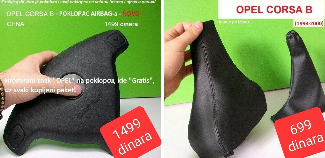 Pored pomenute Opel Corse B, „NA ZAHTEV KUPCA, IZRAĐUJEMO KOŽICE ZA BILO KOJI MODEL AUTOMOBILA“.
